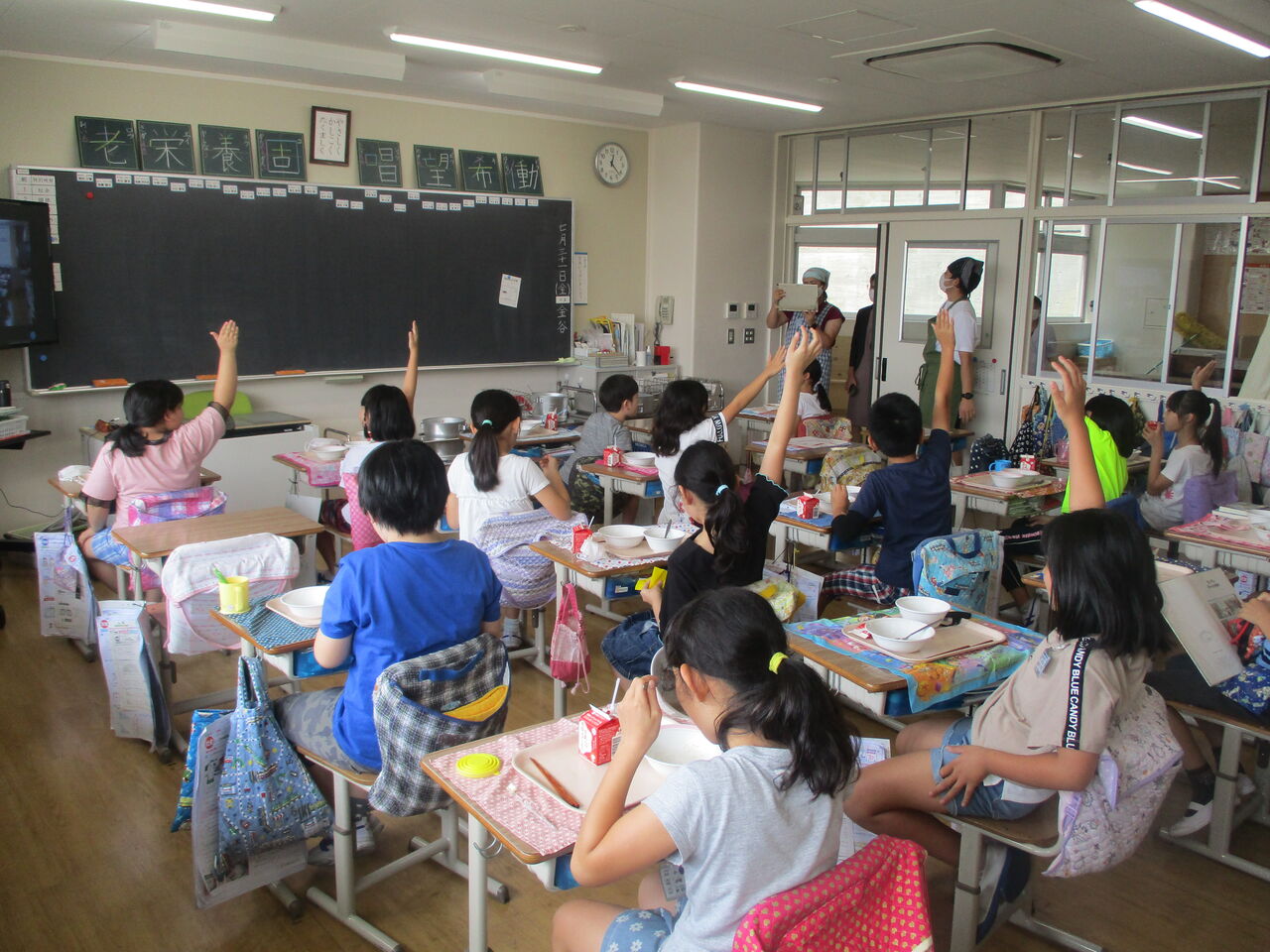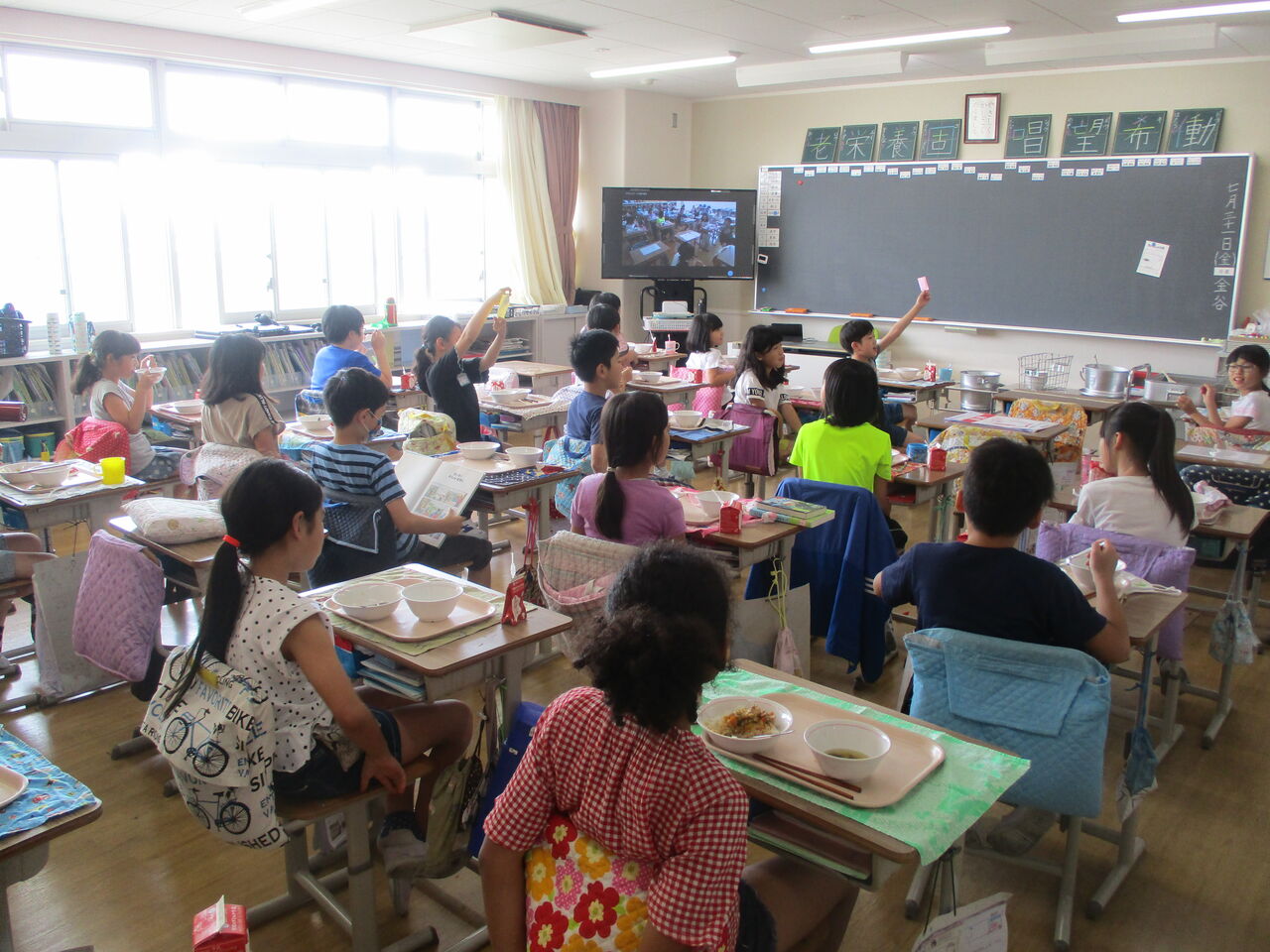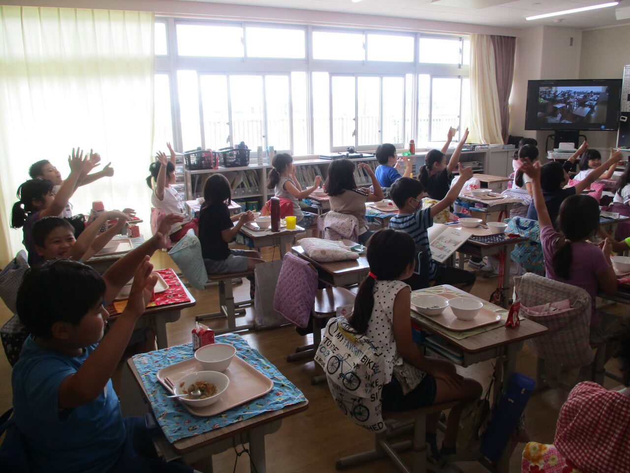 2020年07月31日 4年生 もりもり食べます おいしい給食♪ 学校生活の楽しみの1つといえば、給食ですよね。鹿浜五色桜小学校の給食は、栄養士さんが栄養バランスに気を付けておいしい献立を考え、調理師さんがていねいに愛情をこめて調理しているので、とってもおいしいです4年生の食缶はいつも空っぽになります。今はみんな前を向いて食べ、お話をすることもできませんが、給食を味わっている様子をお届けします。7月31日(金)には、ZOOMで保護者の方ともつながることができ、子供たちもとても楽しそうでした。「おかわりしたい人~?」「は~い」栄養士から、おいしさの秘訣も聞くことができました。これからもおいしい給食、楽しみです