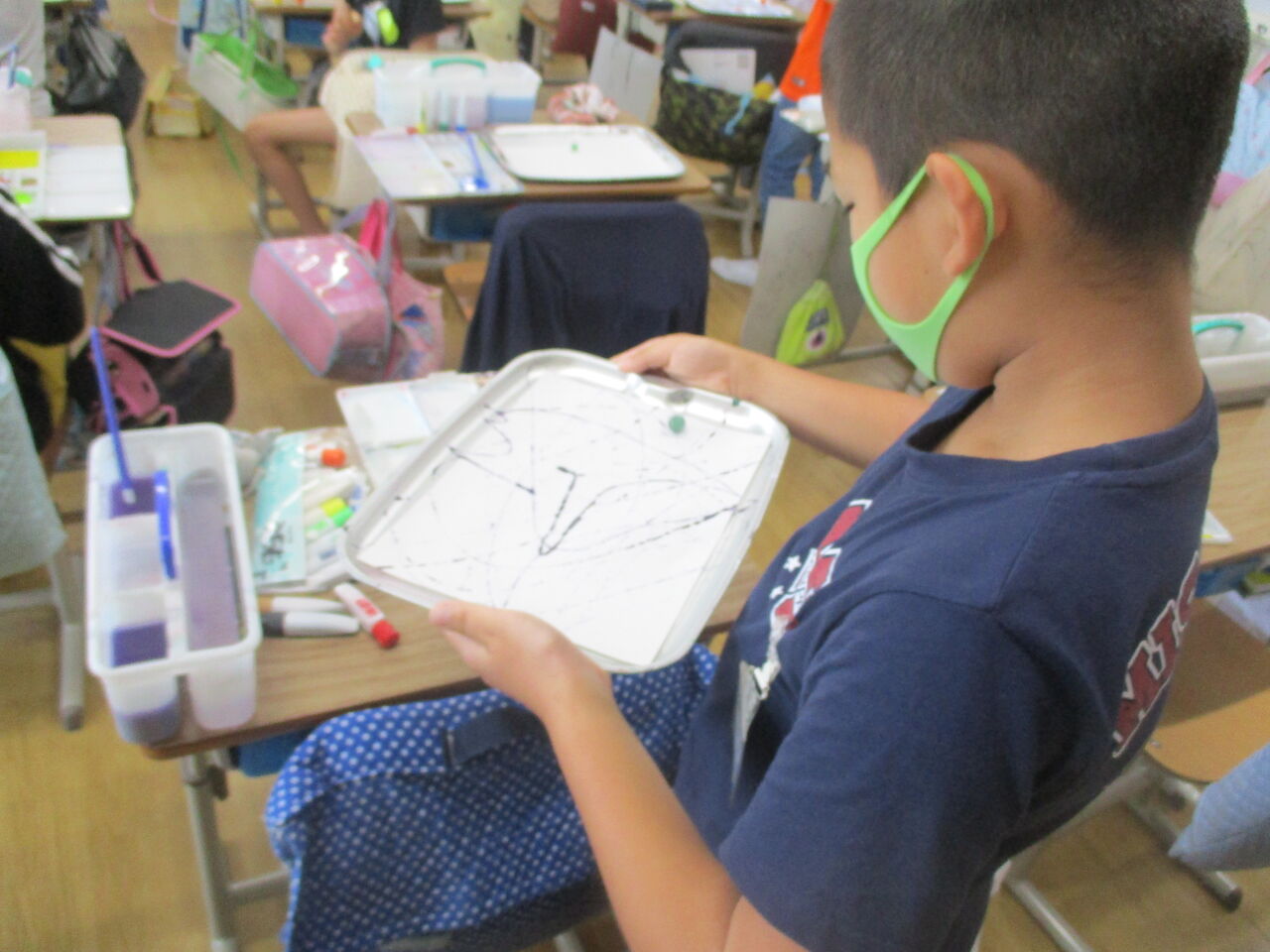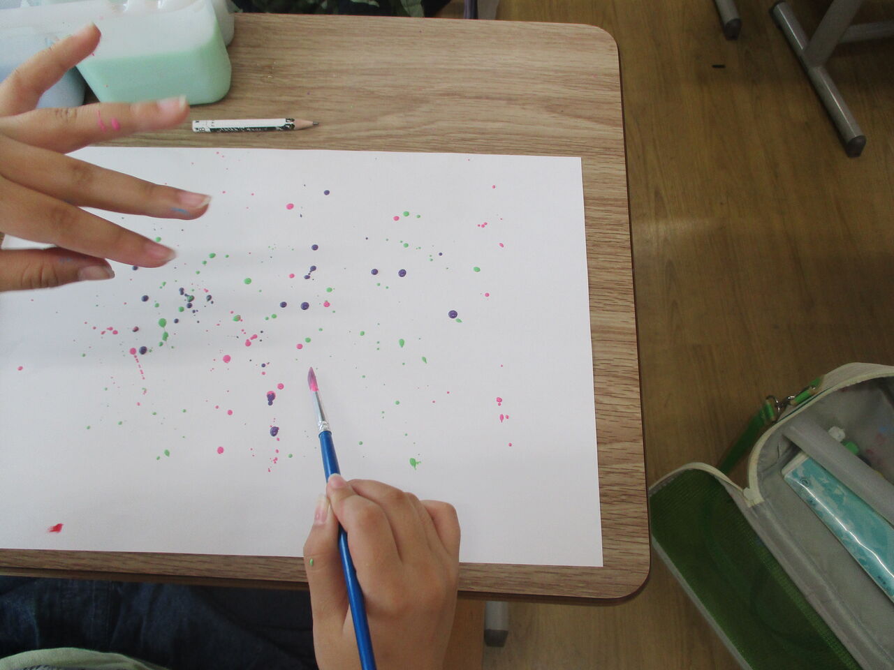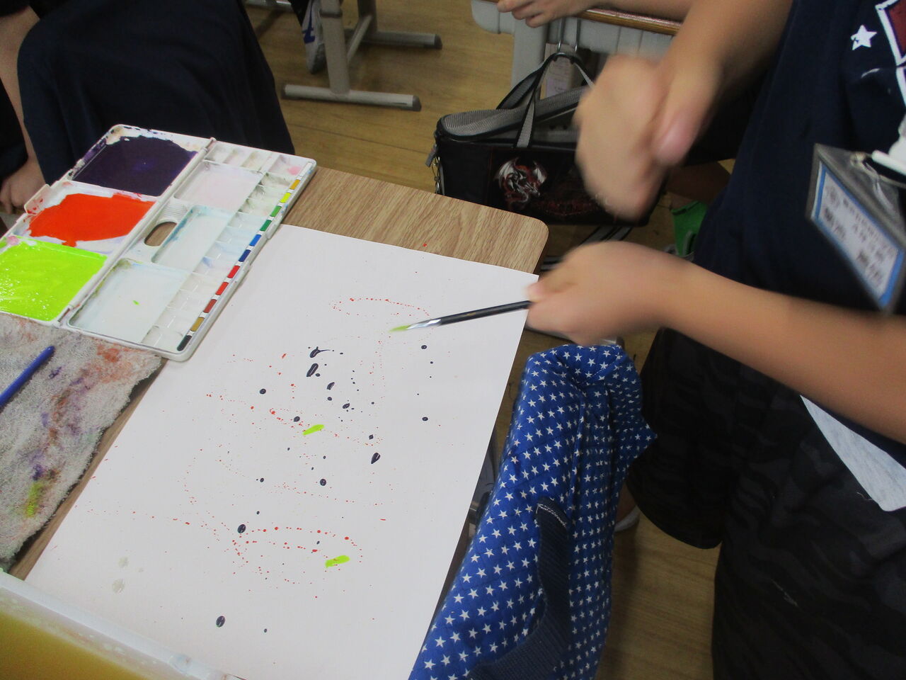 2020年07月15日 4年生 図工の様子 4年生は、図工で「絵の具で夢もよう」の学習をしています。さて、この作品は、どのように制作したでしょうか。正解は、紙の上でビー玉をコロコロコロコロ・・・予想外の方向に進み、素敵な模様が完成しました!他にも絵の具が付いた筆を振ると・・・きれいな色が広がりました!自分だけの、夢のような模様をたくさん作ることができました。