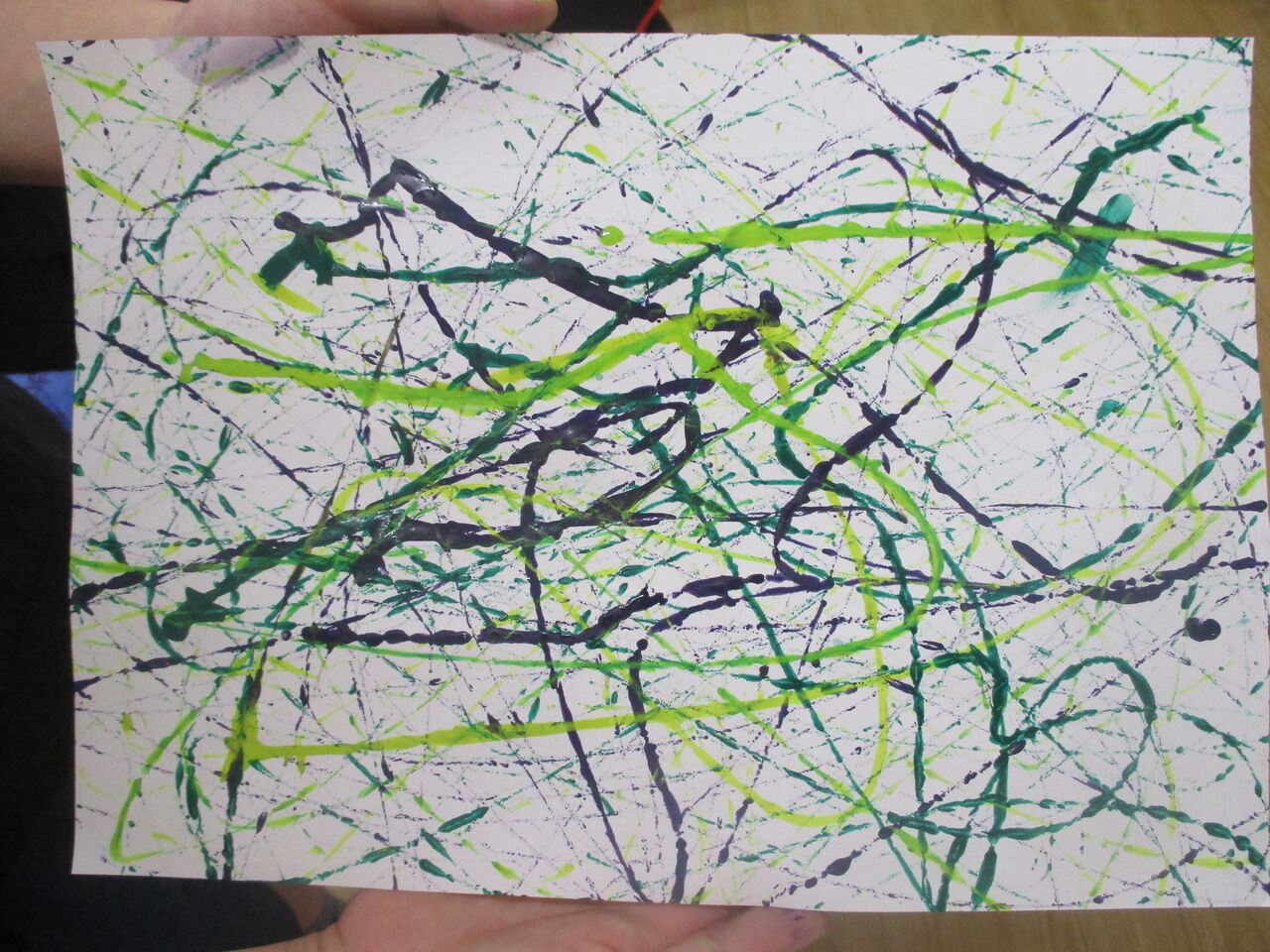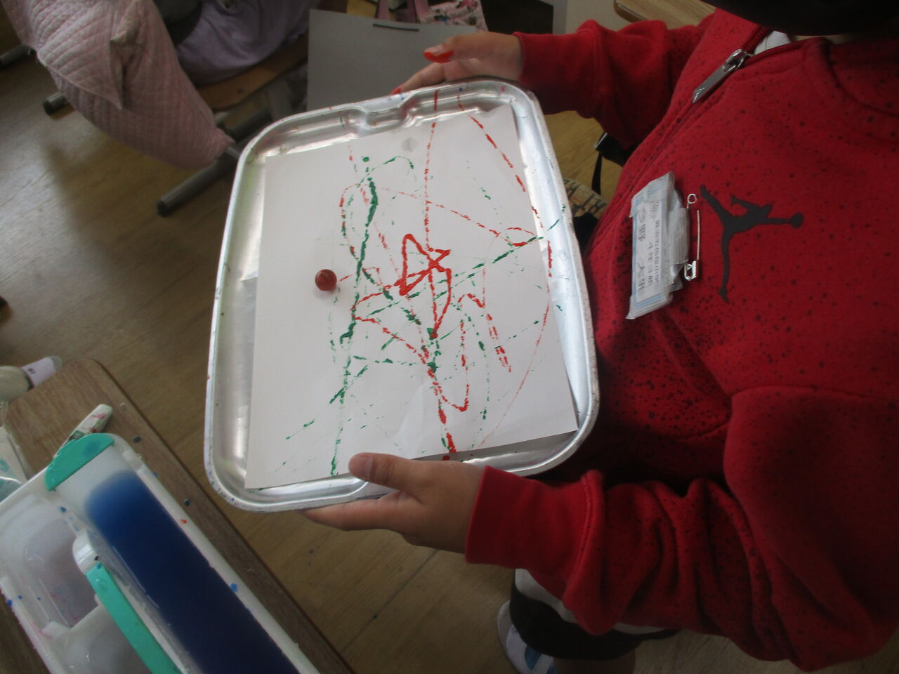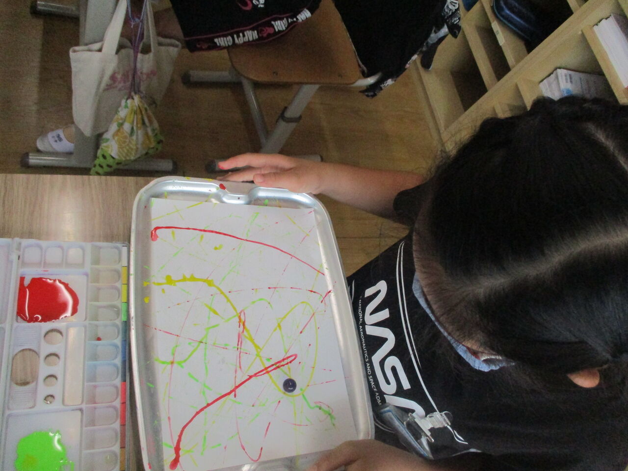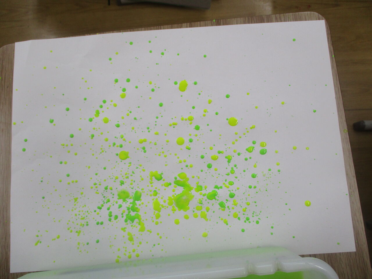 2020年07月15日 4年生 図工の様子 4年生は、図工で「絵の具で夢もよう」の学習をしています。さて、この作品は、どのように制作したでしょうか。正解は、紙の上でビー玉をコロコロコロコロ・・・予想外の方向に進み、素敵な模様が完成しました!他にも絵の具が付いた筆を振ると・・・きれいな色が広がりました!自分だけの、夢のような模様をたくさん作ることができました。