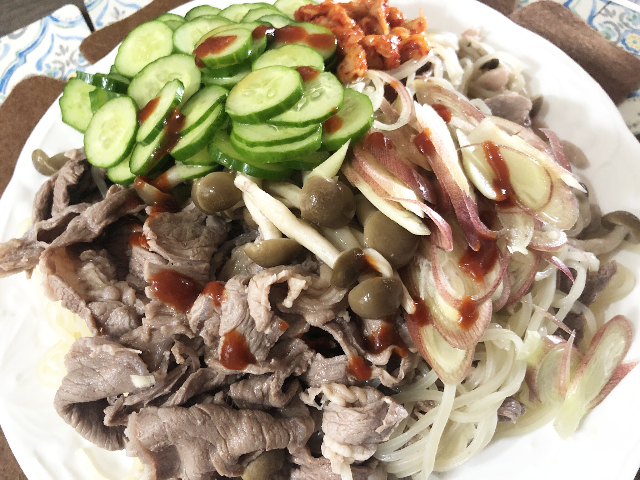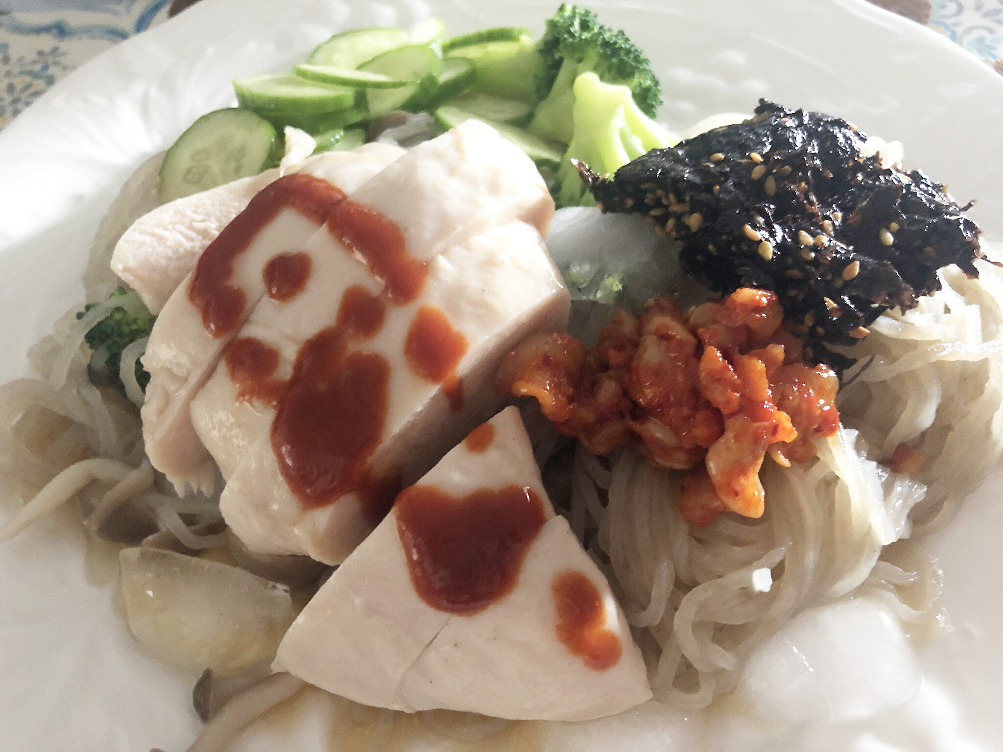 これは冷麺にサラダチキン・しめじ・ブロッコリー・キュウリを添えて、