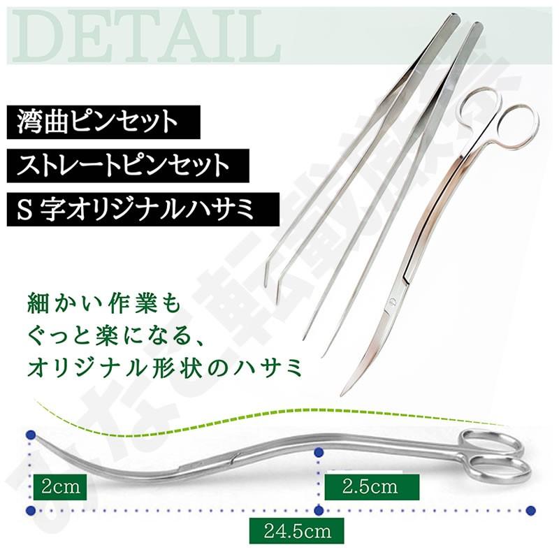 水槽用のピンセットを探していたところハサミも付いてこのお値段はどこよりも安くとってもお得です。 商品も早く届き梱包もきちんとされていました。 水草を植えたり、レイアウト変更したりする際にこの長さのピンセットがあるととても便利です。良い買い物ができました!