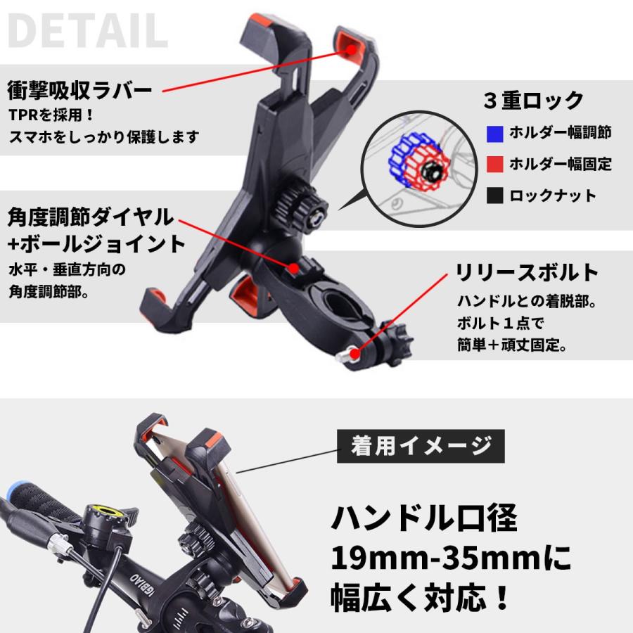 まだ車体に装着と、スマホをホールドさせただけなのでまだわかりませんが、なかなかガッチリと保持できてるように思います。 当方MTBへの装着で、まだ林道やトレイルを試してないので振動でどうなるかはわかりませんが、舗装路では問題ないかと思います。 ハンドルバーの対応が〜35mmまでと説明にはありますが、表記ミスなのかな? 間違いなく35mmハンドルには非対応です。