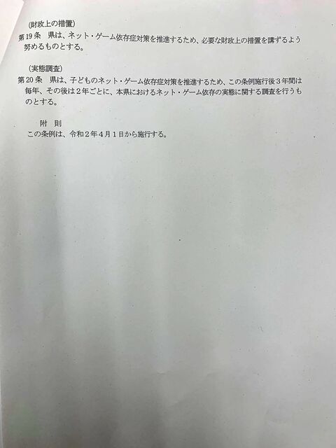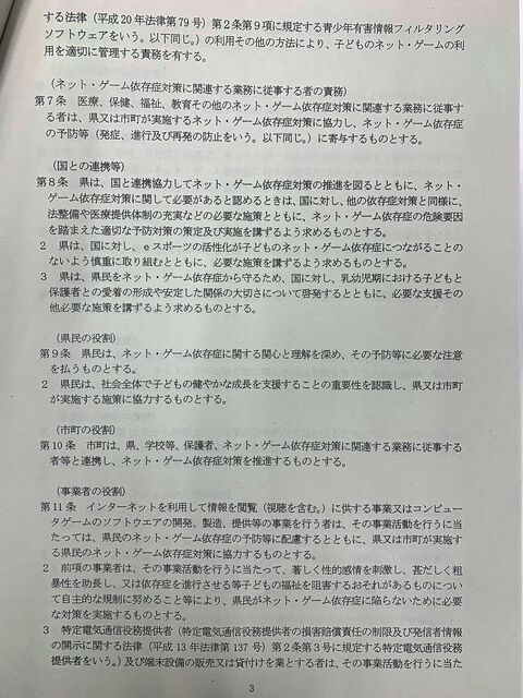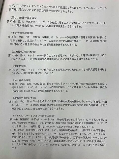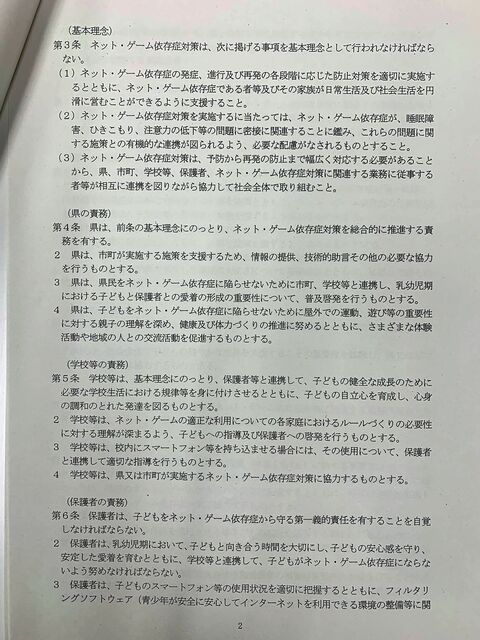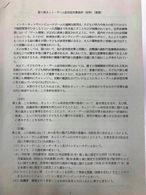 午後に開かれた条例検討委員会で示された「香川県ネット・ゲーム依存症対策条例(仮称)」の素案を事務局からもらいました。