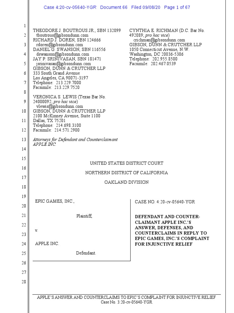 APPLE’S ANSWER AND COUNTERCLAIMS TO EPIC’S COMPLAINT FOR INJUNCTIVE RELIEF Case No. 3:20-cv-05640-YGR