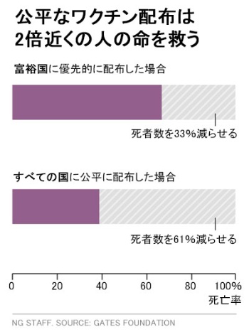 「最も豊かな人々に配布するような使い方は間違っています」とゲイツ氏はナショナル ジオグラフィック英語版編集長スーザン・ゴールドバーグとのインタビューで述べた。「まず最終目標を設定し、世界のために前例のない方法で協力しましょうと皆に呼び掛けるべきです」(参考記事:「「貧困への逆戻りが起きる」ビル・ゲイツ氏に聞くコロナ下の世界」)