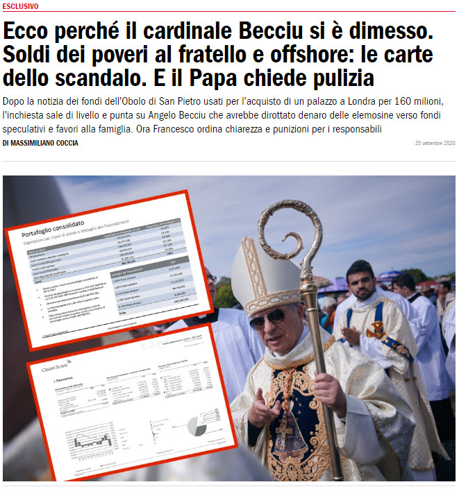Según ha publicado la revista italiana 'L'Espresso', el ex cardenal italiano tejió a su alrededor una red de corrupción para pilotar inversiones vaticanas hacia fondos especulativos con sede en paraísos fiscales. La revista le acusa de haber transferido hasta 100.000 euros del mismo Óbolo de San Pedro, sobre el que tenía autoridad directa como Sustituto de la Secretaría de Estado, hasta la cooperativa cooperativa Spes, cuyo representante legal es su hermano, Tonino Becciu. Esta suma estaría vinculada, según su versión, a obras de reforma en la sede de Cáritas Ozieri (provincia de Sácer, en Cerdeña).