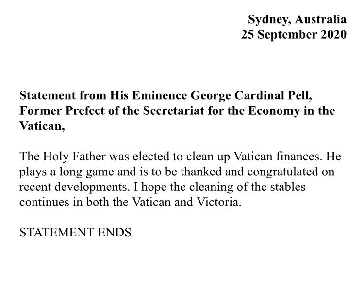 Y hablando de "vendetta", en un clima de los más enrarecido, de ajuste de cuentas, hizo mucho ruido que el cardenal australiano George Pell-zar de las finanzas del Vaticano desde 2014, que debió irse en julio de 2017 para defenderse en un juicio por pedofilia del que salió absuelto- y viejo enemigo de Becciu, en una declaración, celebrara su despido. "El Santo Padre fue electo para hacer limpieza en las finanzas del Vaticano. Él juega una largo partido y se le debe agradecer y felicitar por los recientes hechos. Espero que la limpieza del establo continúe tanto en el Vaticano como en Victoria", expresó que Pell, que aludió a uno de los estados de Australia donde fue condenado, arrestado y luego absuelto.