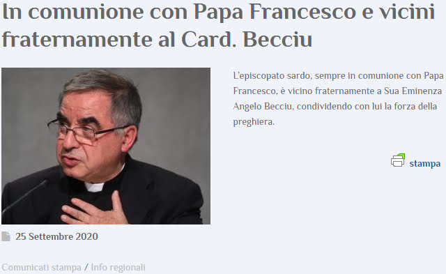 No obstante, el propio Becciu, que se presentó muy angustiado ante la prensa, aseguró que lo de Londres no tenía nada que ver, sino con presuntos "actos de peculado" que habría cometido siendo sustituto al enviar un giro de 100.000 euros del Obolo de San Pedro a una cooperativa de Ozieri, el pueblo de Cerdeña de donde es oriundo y "brazo operativo de Cáritas", que maneja uno de sus hermanos. Becciu explicó que lo hizo para ayudar a su diócesis, donde hay mucha pobreza y desocupación y que por ende no había hecho nada de malo. Al respecto, recordó que el sustituto está autorizado a utilizar el Obolo de San Pedro para fines de caritativos. "Además, esos fondos siguen estando ahí para ayudar a los pobres", se justificó.