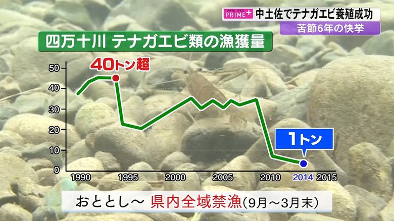 1990年代のピーク時には40トンだった四万十川のテナガエビ類の漁獲量は、環境の悪化や獲り過ぎにより次第に数が減少。2014年には1トンにまで落ち込んだ。