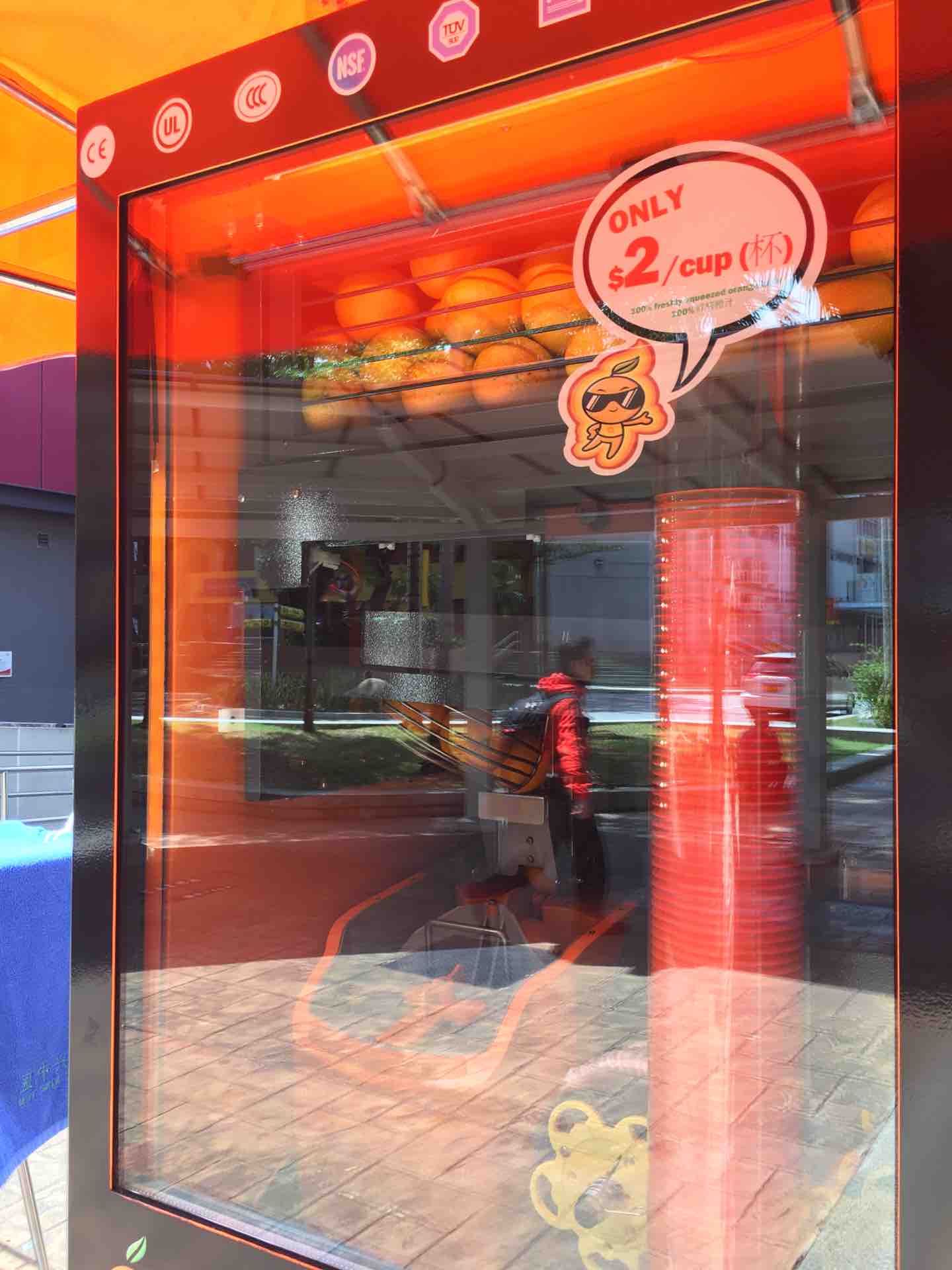 なんで生絞りオレンジジュースの自動販売機が向かい合って並んでるんだろう。