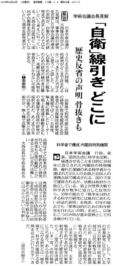 大西会長は、これまで繰り返し、「学術会議の両声明は堅持している」と述べています(毎日新聞2015年12月24日夕刊)。そうだとすれば、大西会長は67年声明と同様に、軍事と民事の区別が一段と困難になっているいま、科学研究の成果が軍事に利用されることのないよう一層の注意を喚起すべきなのであって、軍事と民事の区別が困難になったことを理由にどこまで軍事利用を認めるかを検討するというのは筋が通りません。