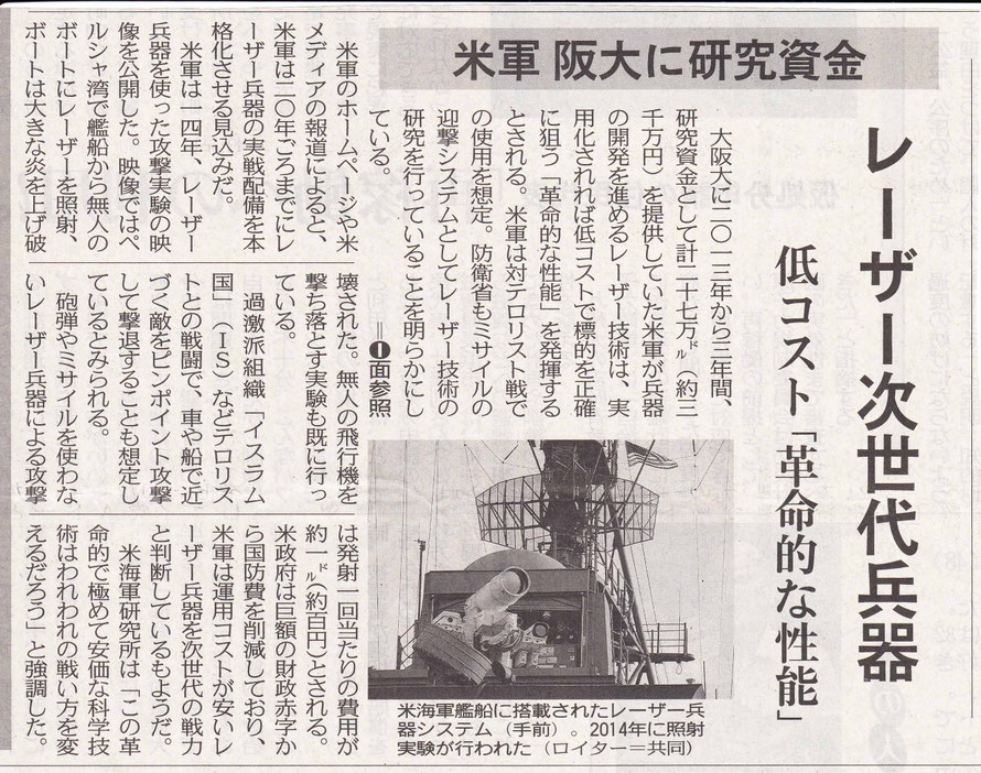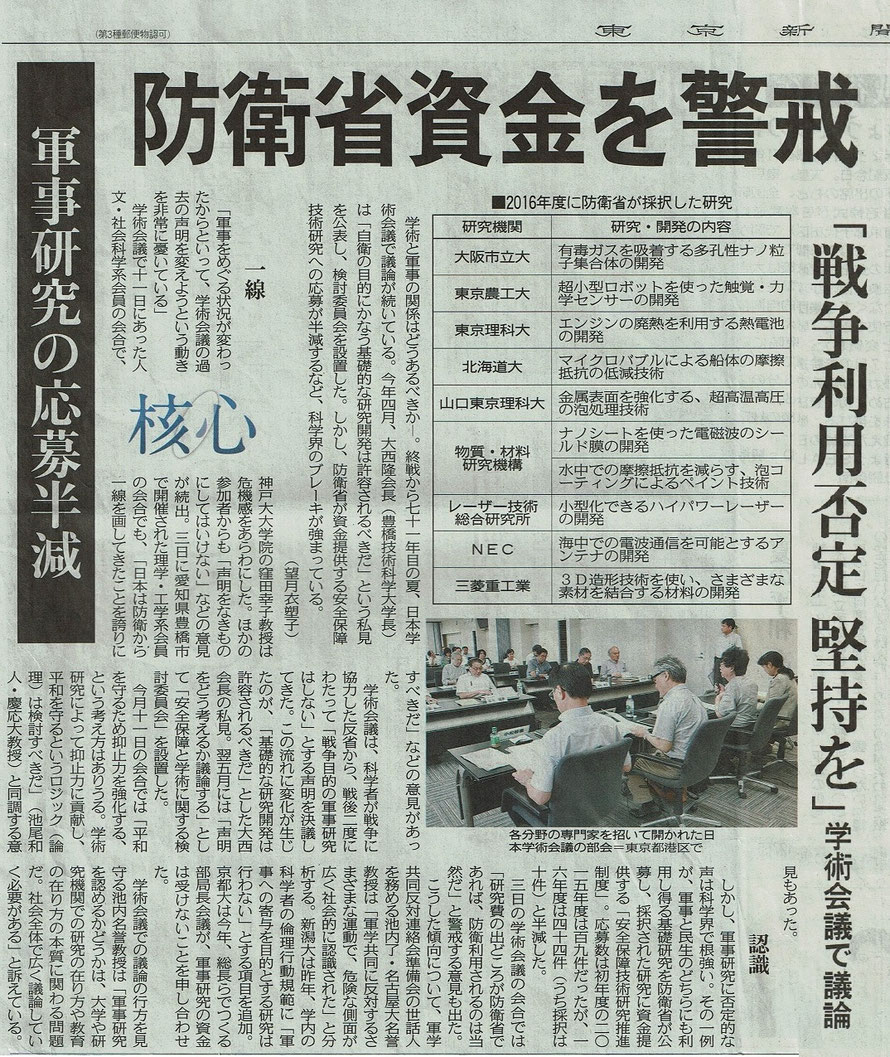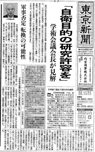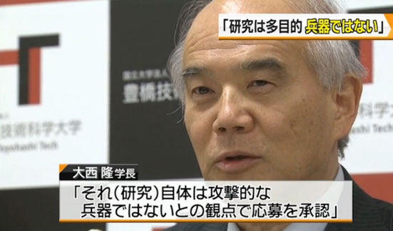 豊橋技術科学大学は、防衛省が自衛隊の装備などへの応用が期待される研究に対し研究費を支給する制度で、有毒ガスなどを効果的に吸着する繊維の研究が採用され、年間約470万円を受け取っています。これが「軍事研究になる」として、約9000人の反対署名が提出されたことを受けて会見した大西隆学長は、「研究は多目的に使われる。それ自体は攻撃的な兵器ではないという観点で、応募することを承認した」と述べました。(引用 終わり)