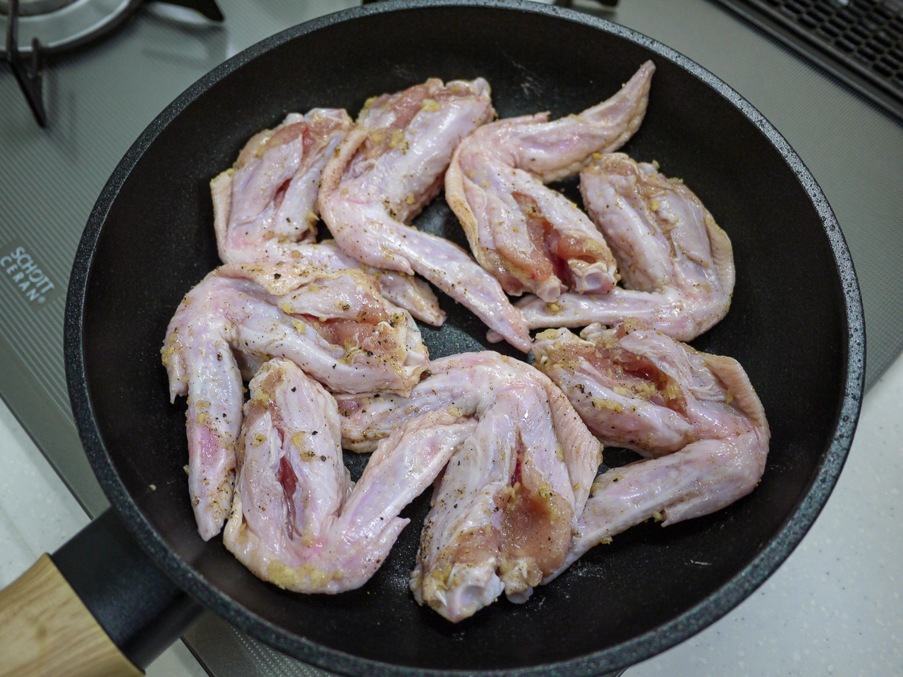 ④ 熱したフライパンにサラダ油を入れて手羽先の皮の部分を下に