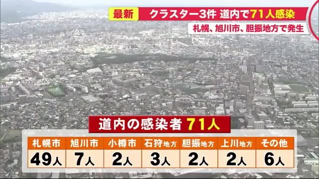 道によりますと、石狩地方12人、空知地方6人、オホーツク地方2人、釧路地方2人、上川地方1人、十勝地方1人、道外在住者1人の感染が確認されました。