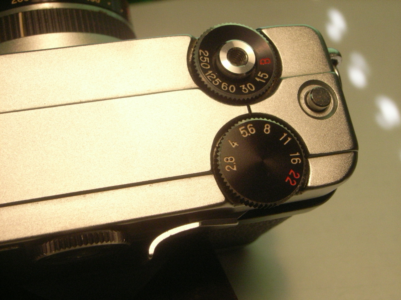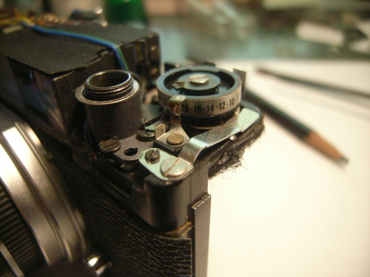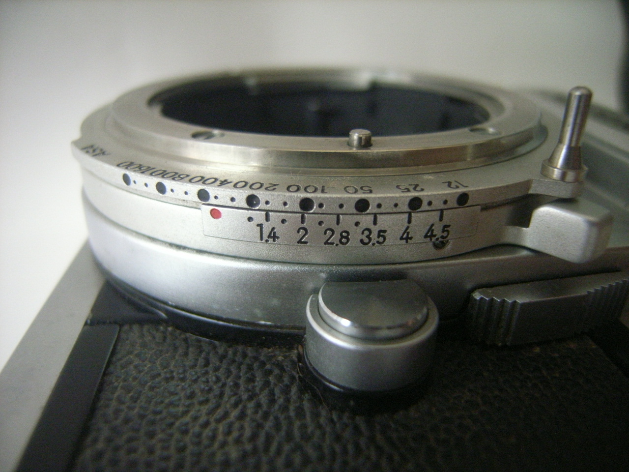 絞りとシャッターの値はメーターの回転で、ASA値はCDS前の穴あき