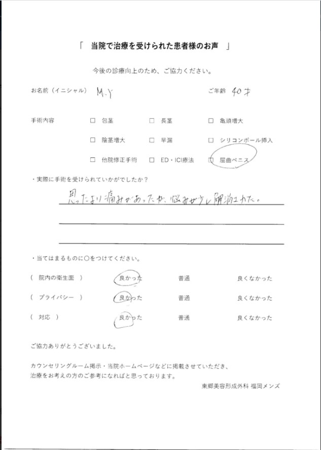 TAGS: 体験談屈曲ペニス修正手術 CATEGORY: 男性器の悩み 公開日:2020/09/25 最終更新日:2020/11/24 東郷美容整形外科 福岡で屈曲ペニス修正手術を受けた人の体験談! 投稿日:2020年9月25日 更新日: ※患者様のアンケートの文章をそのまま掲載しております。 ※東郷美容整形外科 福岡様の了承を得て掲載しております。 ※症状や効果については個人差がございます。 患者様体験談 M.Yさま 40歳 施術後の感想 思ったより痛みがあったが、悩みが少し解消された。 Twitter Facebook Google+ Pocket B!はてブ LINE -男性器の悩み -体験談, 屈曲ペニス修正手術 執筆者: