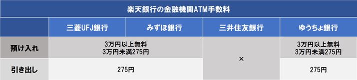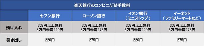 楽天銀行は「セブン銀行」、「ローソン銀行」、「イオン銀行」(ミニストップ)、「イーネット」(ファミリーマートなど)のATMで入出金ができます。手数料は下記のとおりで、セブン銀行とイオン銀行の手数料が若干安くなっています。