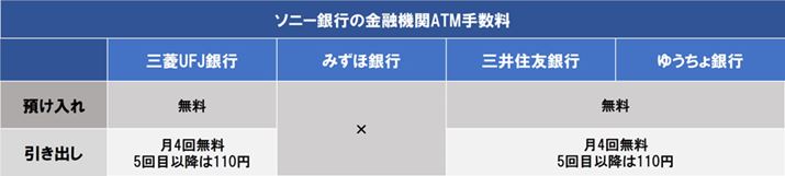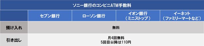 ソニー銀行は「セブン銀行」、「ローソン銀行」、「イオン銀行」(ミニストップ)、「イーネット」(ファミリーマートなど)のATMで入出金ができます。各行のATMとも引き出しは月4回まで無料。5回目以降は1回110円の手数料がかかります。ATMへの預け入れは金額、回数を問わず無料です。