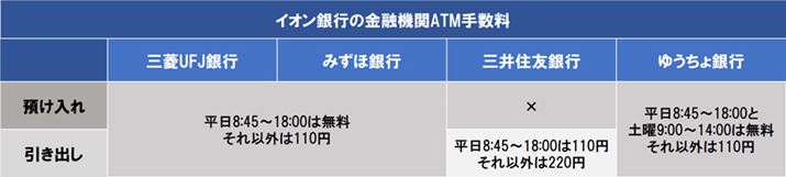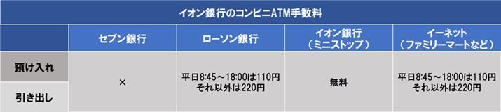 イオン銀行は、「イオン銀行」(ミニストップ)、「ローソン銀行」、「イーネット」(ファミリーマートなど)のATMが使えます。イオン銀行のATMでの入出金は24時間365日、何回でも手数料無料です。ローソン銀行、イーネットのATMでの入出金には、平日8時45分~18時は110円、それ以外は220円の手数料がかかります。