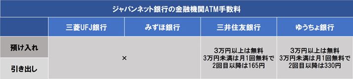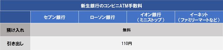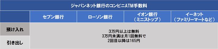 「セブン銀行」、「ローソン銀行」、「イオン銀行」(ミニストップ)、「イーネット」(ファミリーマートなど)のATMで入出金が可能。入出金のいずれも3万円以上なら24時間365日、何回でも手数料無料。1回3万円未満の場合は月1回まで手数料無料で、2回目以降は時間帯に関係なく165円かかります。
