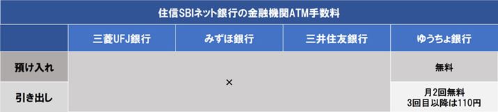 提携している「みずほ銀行」、「三菱UFJ銀行」、「ゆうちょ銀行」のATMも、入出金にかかる手数料は「時間内無料」です(平日8時45分~18時まで。ゆうちょ銀行のみ土曜9時~14時も該当。これ以外の時間帯には銀行ごとに異なる手数料がかかかります)。「三井住友銀行」のATMは引き出しのみ対応しており、平日8時45分~18時までは110円、それ以外の時間帯は220円の手数料で使えます。