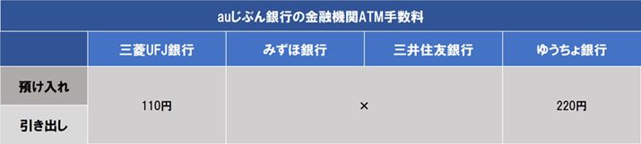 「三菱UFJ銀行」および「ゆうちょ銀行」のATMが利用できます。三菱UFJ銀行ATMのルールは上記のコンビニATMと同じです。ゆうちょ銀行ATMの手数料は若干高くなっており1回220円です。金融機関ATMも「じぶんプラス」のステージ2以上にならないと手数料がかかります。