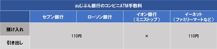 コンビニATMは「セブン銀行」、「ローソン銀行」、「イーネット」(ファミリーマートなど)が利用できます。手数料は、入出金とも1回110円です。利用状況に応じて変わる優遇制度「じぶんプラス」(ステージ1~5。申し込み時はステージ1)の、ステージ2以上にならないと必ず手数料がかかる仕組みです。
