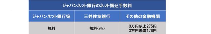ジャパンネット銀行宛であれば振込金額にかかわらず手数料無料。他行宛は振込金額1回3万円未満は176円、3万円以上は275円かかります。なお、ジャパネット銀行、三井住友銀行のいずれも本人名義の口座を持っている場合は、「ジャパンネット銀行→三井住友銀行」間の振り込みが無料で行えます。