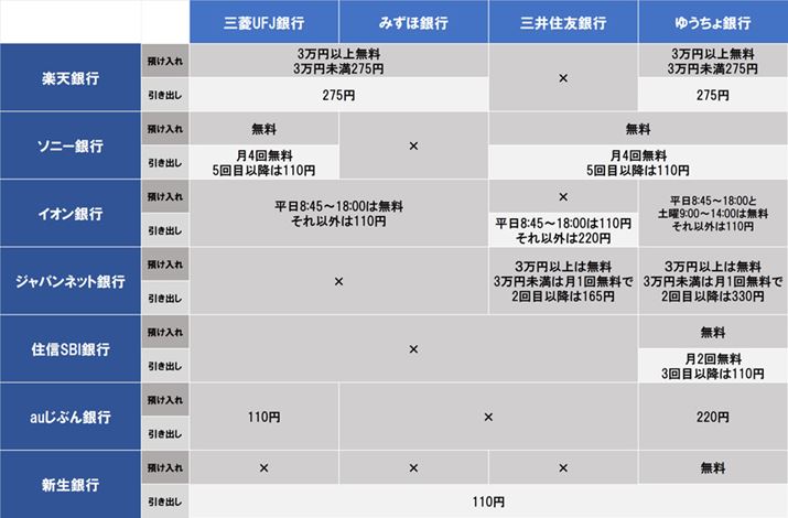 7つのネット銀行の大手金融機関(メガバンク+ゆうちょ銀行)ATMの対応状況と手数料