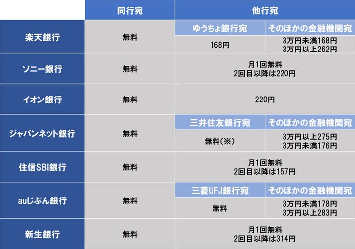 7つのネット銀行のコンビニATMの対応状況と手数料 ※ジャパンネット銀行、三井住友銀行の双方とも本人名義で、ジャパンネット銀行→三井住友銀行宛の振り込みの場合、手数料無料