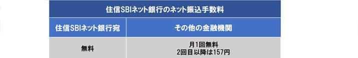 住信SBIネット銀行宛であれば振込手数料は無料です(本記事の比較対象ではありませんが「三井住友信託銀行」宛も振込手数料は無料)。他行宛は月1回まで手数料無料で、2回目以降は1回157円です。