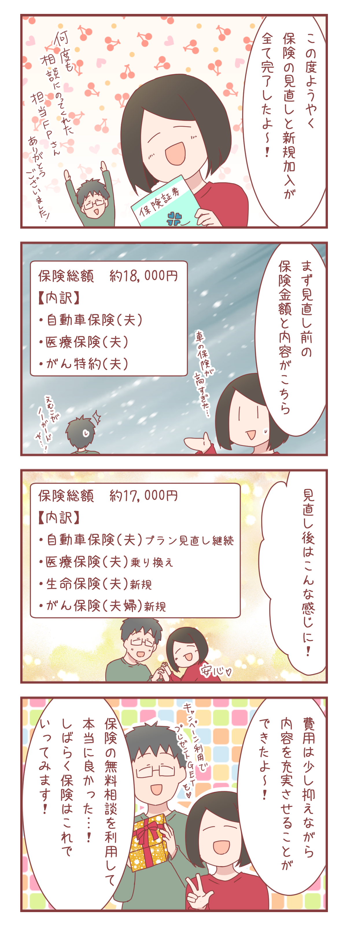 キャンペーンのプレゼントに関しては、色々あるのかな?って思うけど、私達も夫の誕生日が来てしまう前に切実に保険の見直しが必要だったから利用したし、それにFPさんもとても親切にしてくれたので私はよかったと思っています。