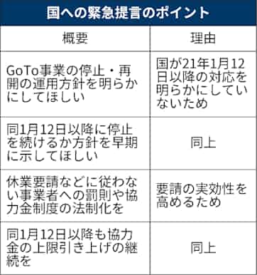 Go To トラベルなどを巡っては「事業の停止・再開について、感染状況のステージ判断との関連も含めて運用方針を明らかにする」ことを要望。停止期間を延長する場合も全国一律ではなく、感染が減少傾向の地域から順次再開するなど「柔軟な対応」を求めた。