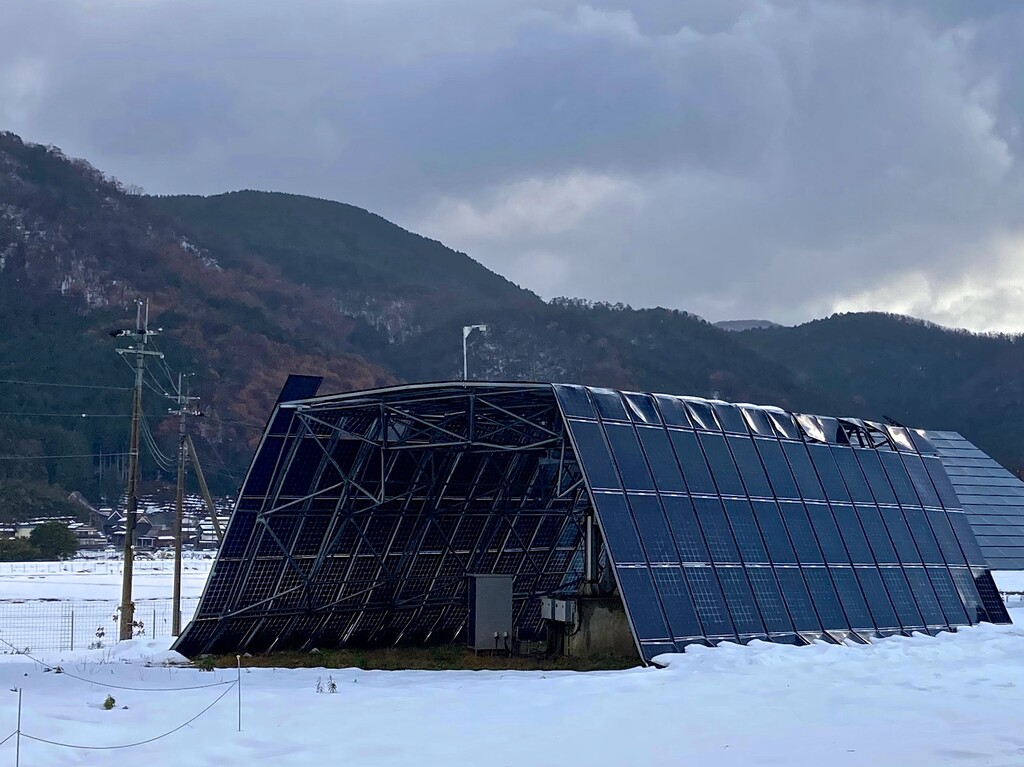 どんなデーターに基づいてマキノに、この雪の多いマキノに設置したのか知らんけど、ここに住んでりゃ小学生でも分かるレベルの想定がされていない❗ これで設計者は、上司に「想定外の積雪により...」とか説明するんだろうか❓