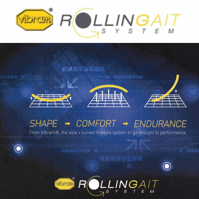 アウトソールに採用されているソールはビブラム(Vibram)社ソールの中で耐久性、防滑性に優れた新開発の Vibram Rollin Gait System(RGS・ビブラム・ ローリングゲイト・システム)を採用。