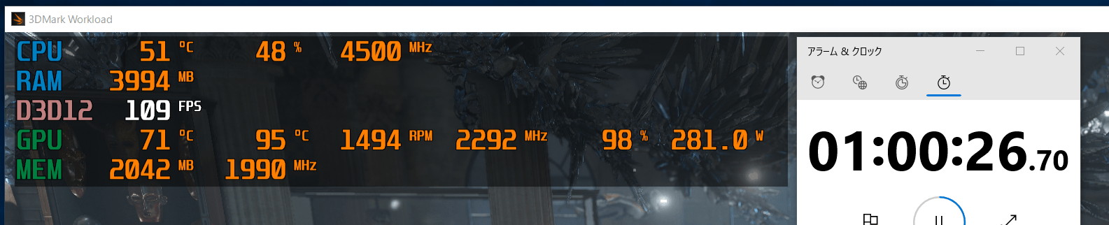 また実用条件に近い冷却性能の検証として、実際にPCケースへ「PowerColor Red Devil Radeon RX 6800 XT」を組み込み、Time Spy Extreme グラフィックテスト1を1時間に渡ってループさせてGPU温度やファン回転数がどうなるかを確認してみました。