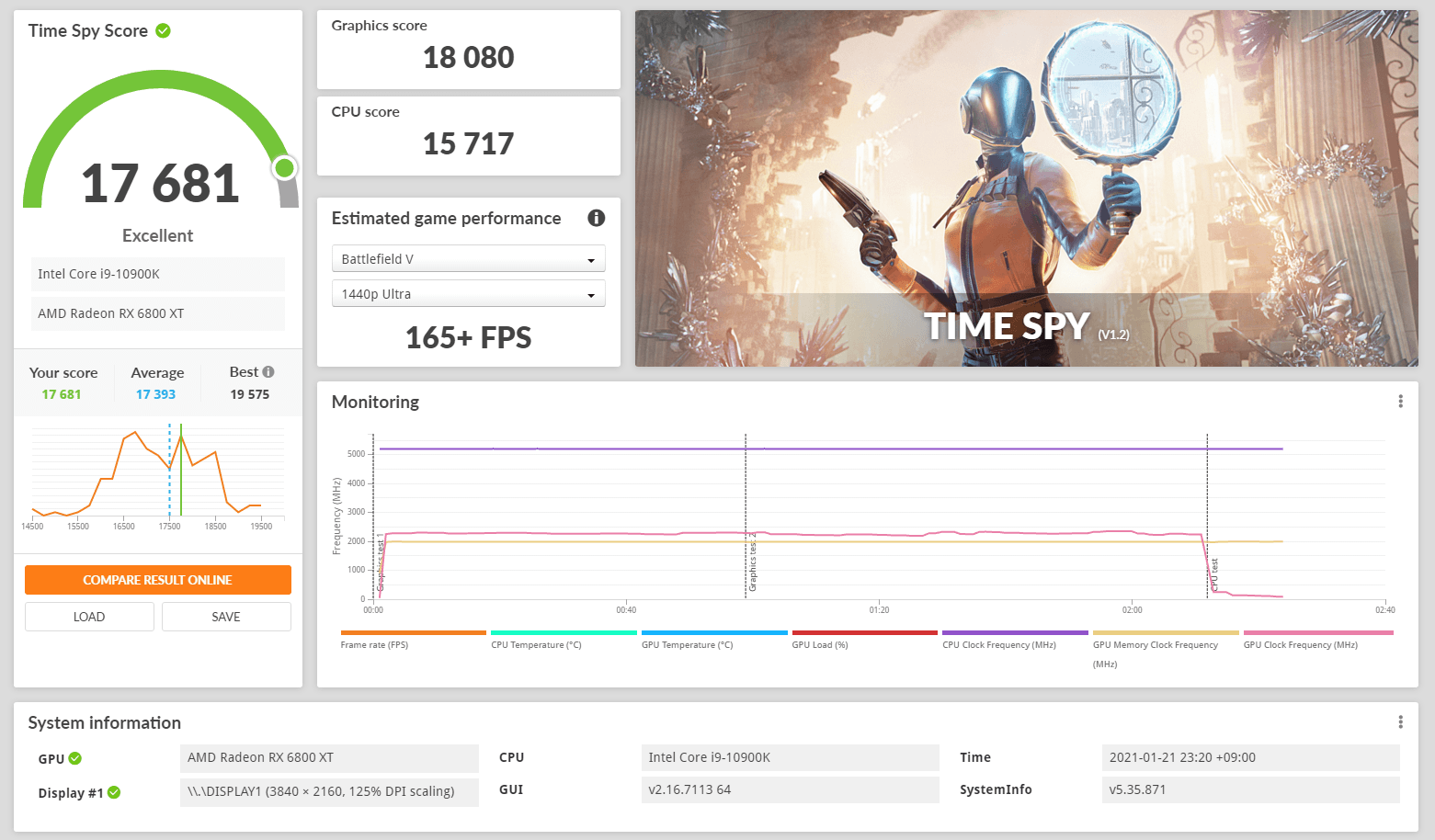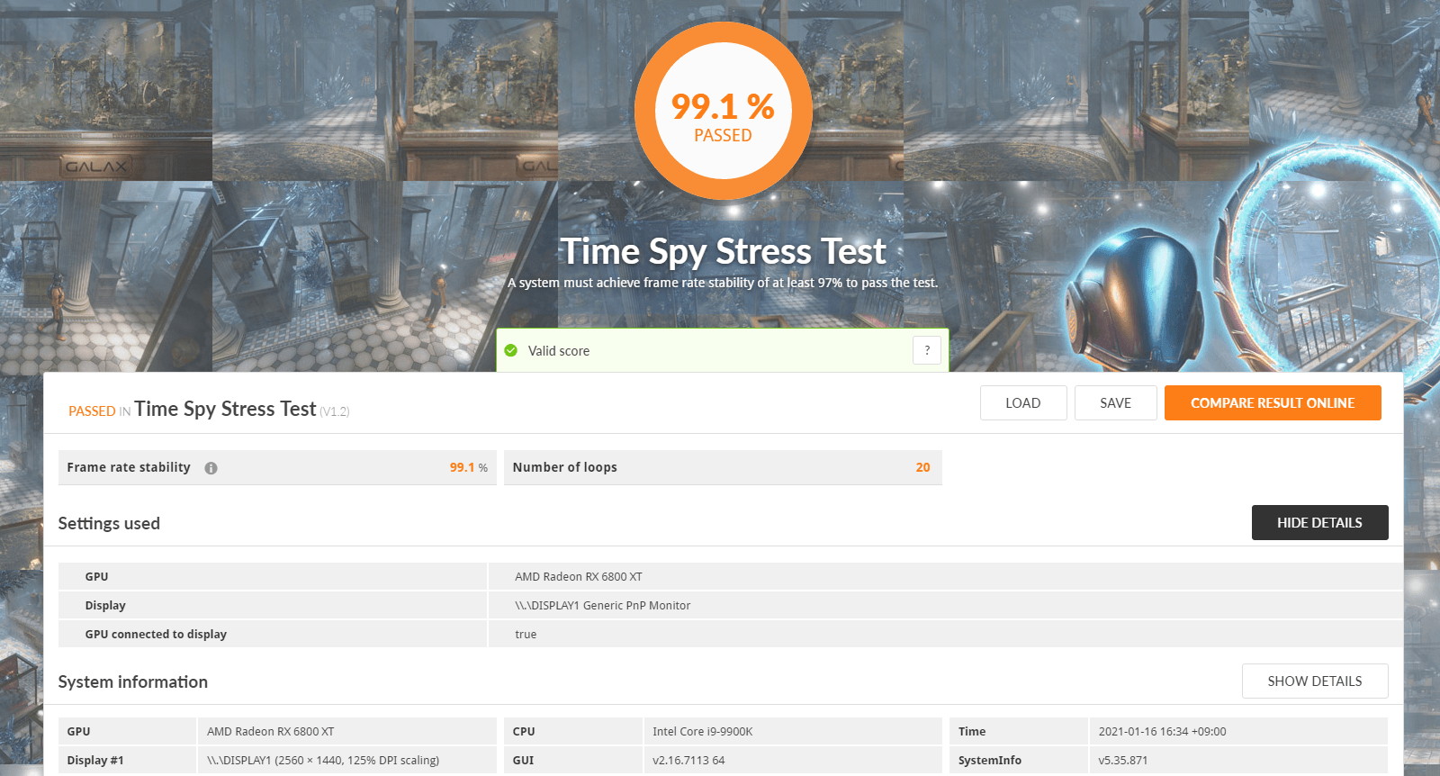 「PowerColor Red Devil Radeon RX 6800 XT」のGPU温度とファンノイズの検証負荷としては約20分間に渡たり連続してGPUに100%近い負荷をかける3DMark TimeSpy Stress Testを使用しています。