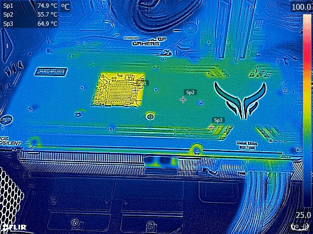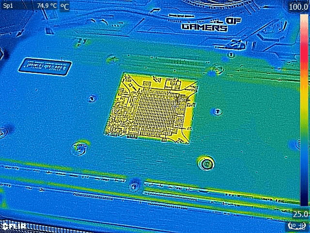 加えて1時間のストレステスト終盤にサーモグラフィカメラ搭載スマートフォン「CAT S62 PRO」を使用してゲーム負荷時のグラフィックボード上の各所の温度をチェックしました。