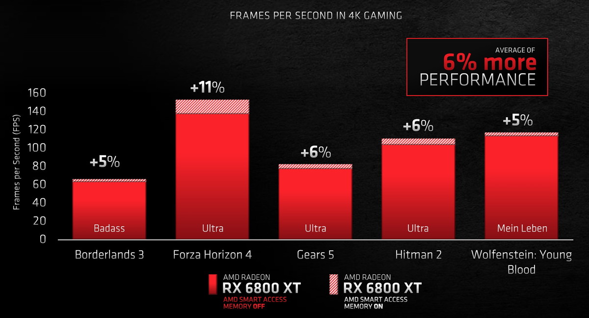 発売前にAMDから公表された10種の実ゲームによる公式ベンチマークでは、RX 6800 XTはRTX 2080と比較してWQHD解像度で37%程度、4K解像度で35%程度も上回るとのことでしたが、Smart Access Memoryが有効であることを加味しても、ベストケースに近い性能が出るタイトルを集めたのだと思います。