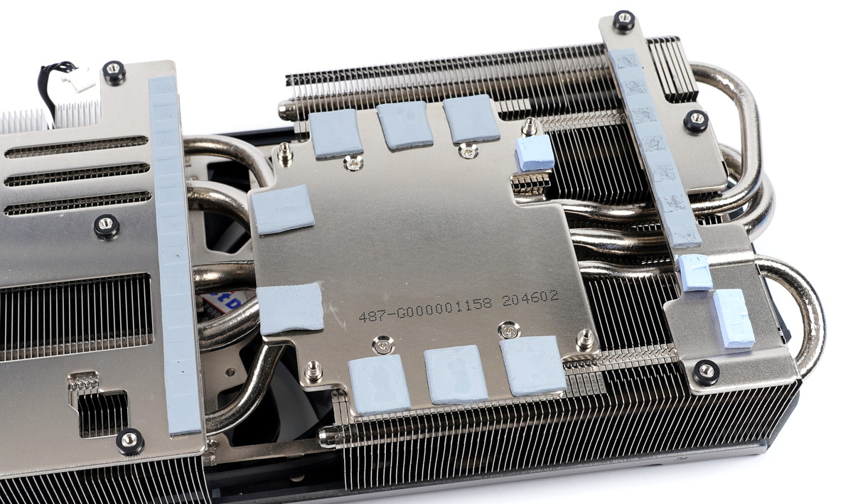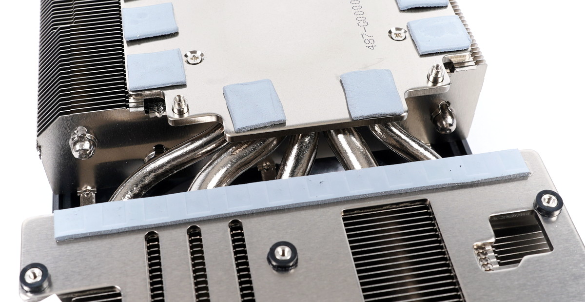 GPUコアと接する部分には冷却性能の高さで定評のある銅製ベースプレートが採用されて、ニッケルメッキ処理も施されています。またGPUコア周辺のVRAMチップはGPUコアと共通の銅製ベースプレートに、VRM電源回路はヒートシンクにろう付けされた金属製プレートに、それぞれサーマルパッドを介してヒートシンク本体で直接冷却するという理想的な構造です。
