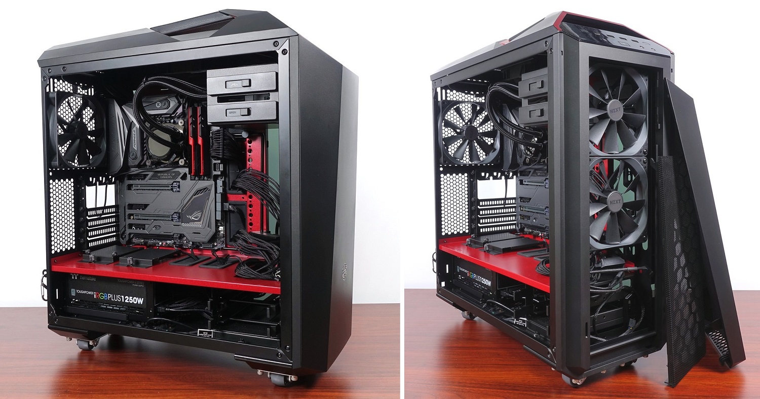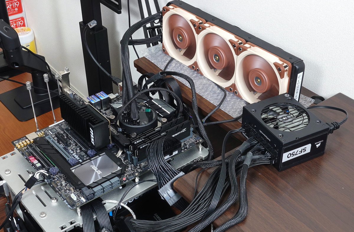検証機材のPCケースには「Cooler Master MASTERCASE MAKER 5t」を使用しています。CPUクーラーは120サイズ簡易水冷でラジエーターを天面前方に設置、またPCケースのフロントに吸気ファンとして3基とリアに排気ファンとして1基の140mm角ケースファンをそれぞれ設置し、ファン回転数は1000RPMに固定しています。
