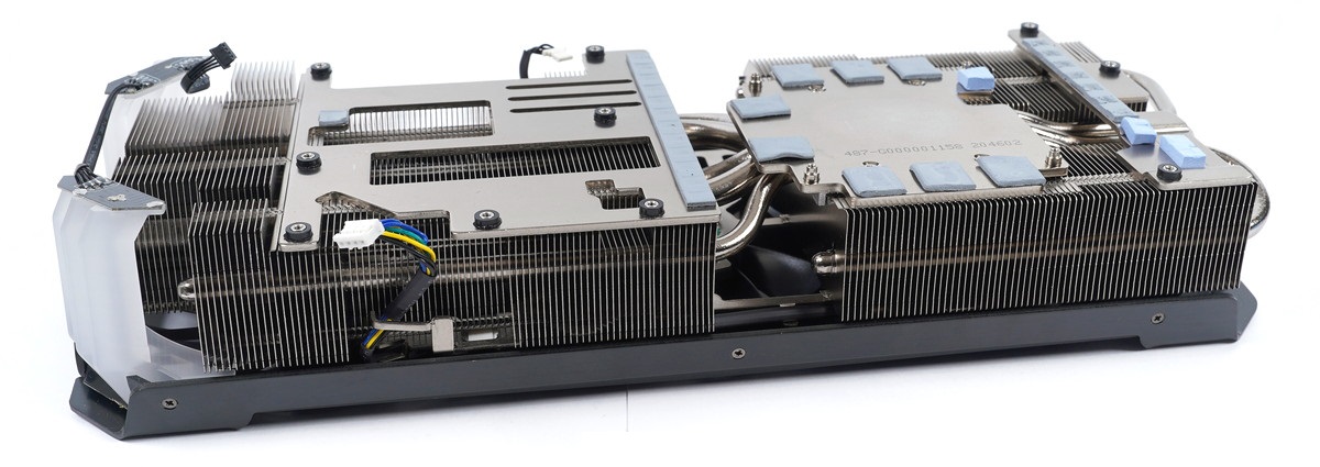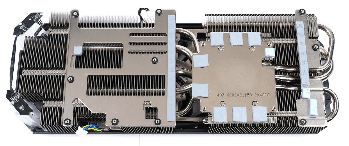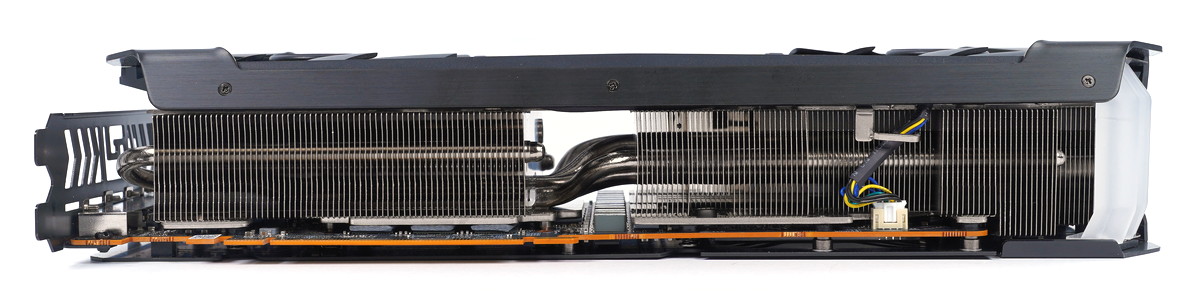 GPUコアと接するベースプレートからは7本の極太ヒートパイプが下から左右へ抜ける構造で(下写真では5本ですが逆方向だけに抜けるヒートパイプも2本あります)、GPUクーラーヒートシンクの放熱フィン全体へ効率的に熱を拡散します。