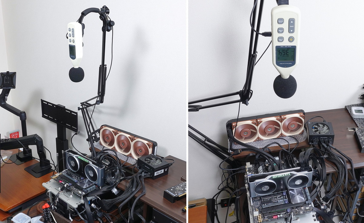 検証機材はベンチ台の上に平置きにしているので、サウンドレベルメーターをスタンドで垂直上方向に50cm程度離して騒音値を測定しています。