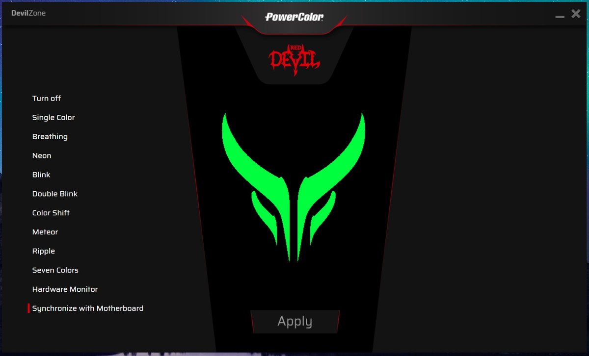 公式ページで配布されているLEDイルミネーション制御用アプリケーション「PowerColor Devil Zone」を使用することで発光カラーや発光パターンを変更できます。