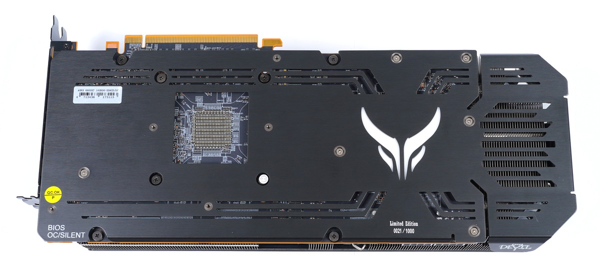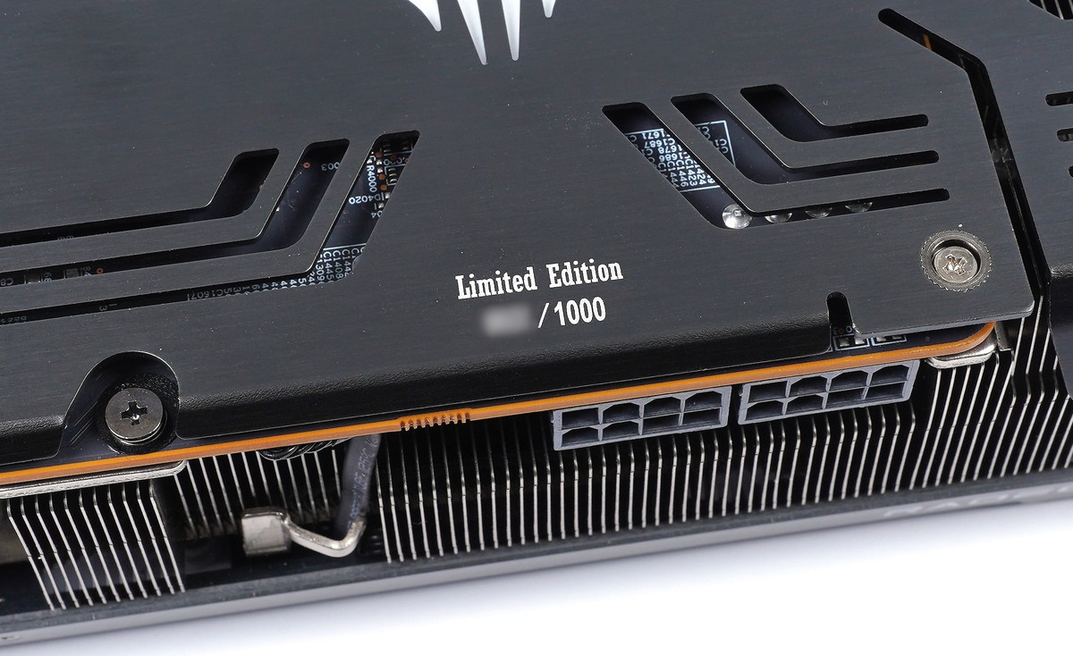 「PowerColor Red Devil Radeon RX 6800 XT」のバックプレート右端にはエアスリットが設けられており、ファンからヒートシンクを通って背面に直接風が抜けるフロースルー構造が採用されています。