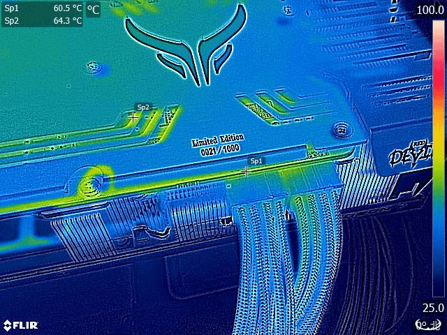 「PowerColor Red Devil Radeon RX 6800 XT」は、バックプレート表面や、背面や側面の隙間から確認できるPCB基板上のVRM電源回路やPCIE補助電源コネクタの付近の温度がホットスポットの最大値でも80度未満に収まっていました。