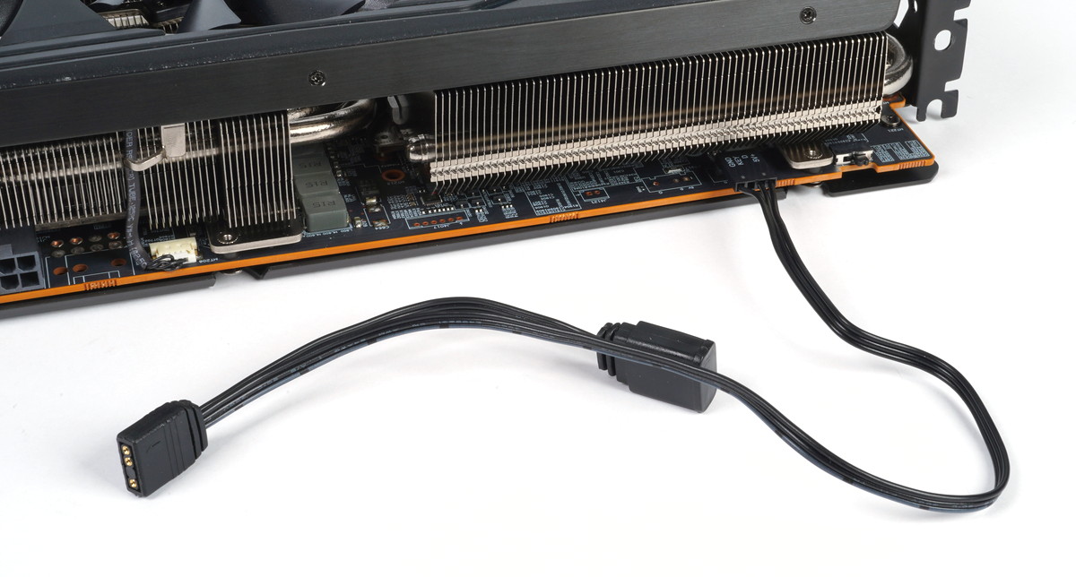 LEDイルミネーションは標準で赤色に発光しますが、グラフィックボード基板上のLEDヘッダーを付属ケーブルを使用してマザーボードなどARGB対応VD-G型汎用3PIN LEDコントローラーに接続することで外部からの制御にも対応します。