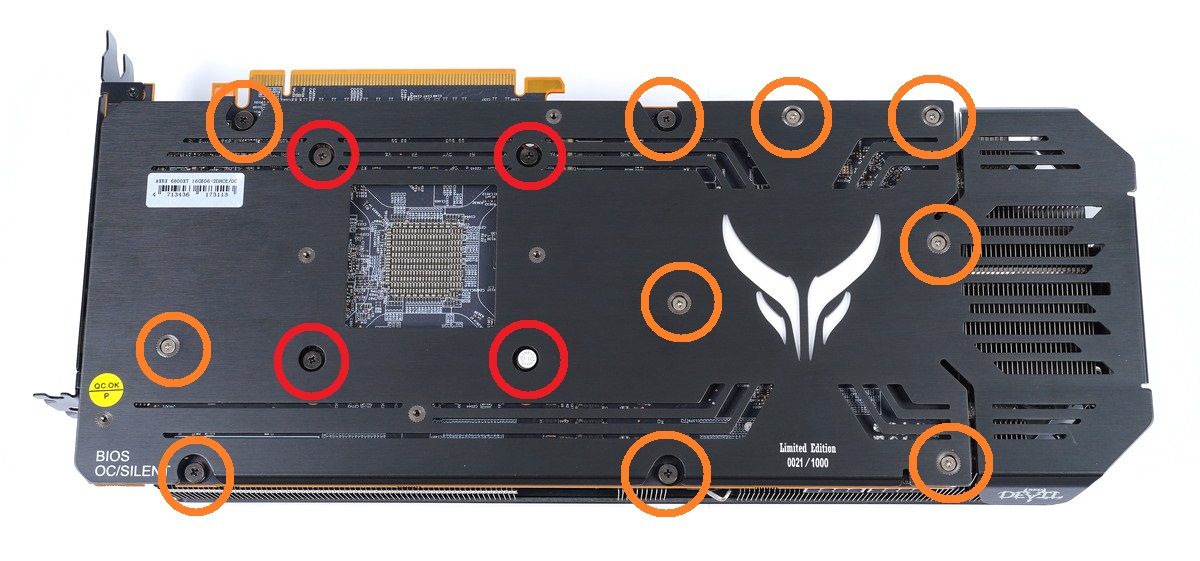 「PowerColor Red Devil Radeon RX 6800 XT」のGPUクーラーは、基板裏面のコア周辺4カ所、バックプレート上10カ所の計14個のネジで固定されていました。