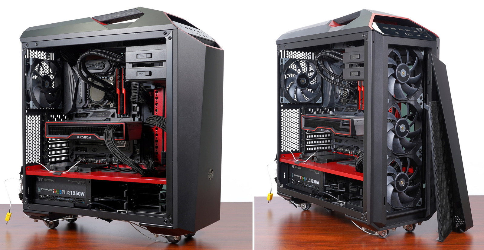 「PowerColor Red Devil Radeon RX 6800 XT」のGPUクーラーは内排気ファンということもありPCケースの吸排気を最適化しないと冷却効率が下がるので、フロントx3/リアx1で140mmファンを設置して1000RPMで回していますが、さすがに300Wを超えるTGPなので、ベンチ板での比較的に理想な環境のままとはいきませんでした。実際にPCケースへ組み込むユーザーはPCケースの吸排気にも注意してみてください。
