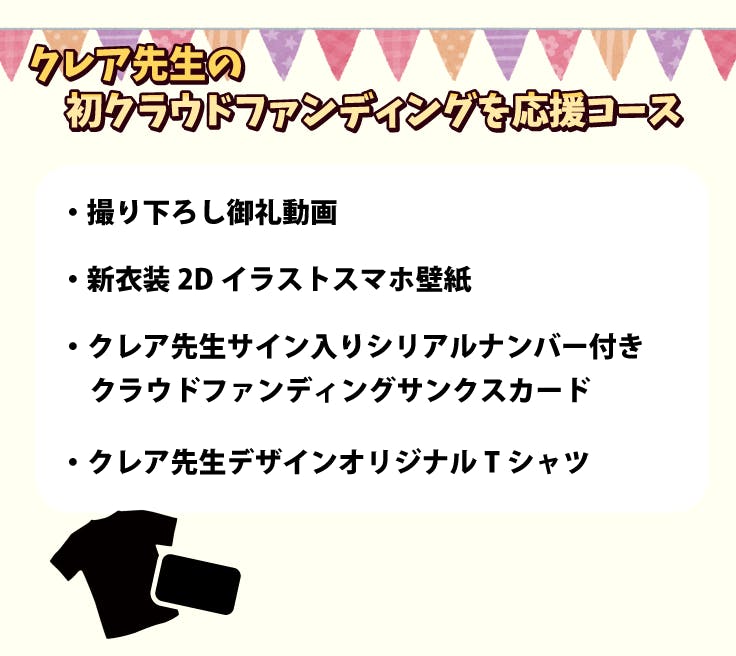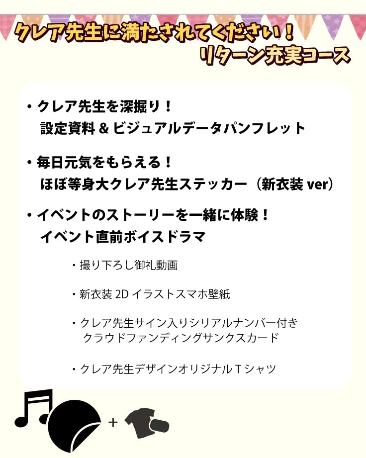 そのためには新衣装やクレア先生初となるオリジナル曲の制作、クレア先生の魅力を余すことなくお伝えするための演出や機材の調達等を実現するために、クレア先生初となるクラウドファンディングを立ち上げさせていただきました。